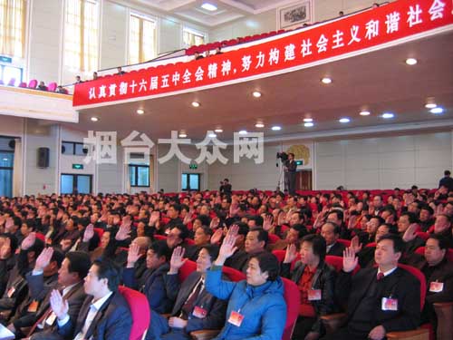 会议号召,全市人民更加紧密地团结在以胡锦涛同志为总书记的党中央周围,高举邓小平理论和“三个代表”重要思想伟大旗帜,全面落实科学发展观,在中共烟台市委的坚强领导下,振奋精神,锐意进取,开拓创新,扎实工作,为开创“十一五”时期经济社会发展的新局面而努力奋斗!