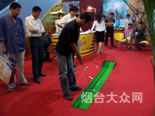 天创集团的展台前人气可以说是整个展会最旺的,一会儿,北京舞蹈学院的舞者热舞不断,一会儿,菲律宾的乐队连歌带舞,一会儿,又送笔送本,吸引了不少围观的观众,真是热闹非凡。瞧,还有人在热闹中找点清闲练一练高尔夫,可见参展企业真是用心良苦。