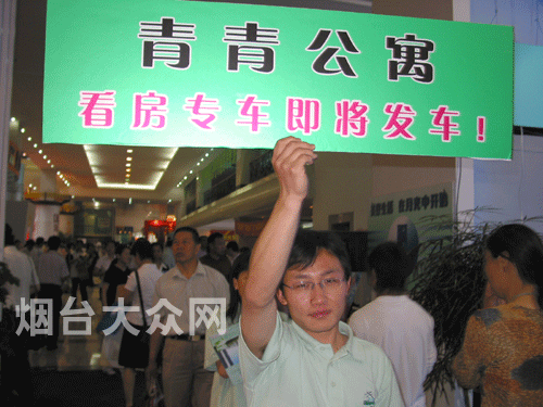 可能看房的专车昨天被冷清了不少,这不企业们又想出了新招,如此走遍展会的每一个角落,不怕你看不见我。果然他们的效果还真不错,截止到下午1时许,据他们的工作人员介绍说,他们半个小时一班的看房车,虽说不是每趟都做的满满的,但人确实也不少。