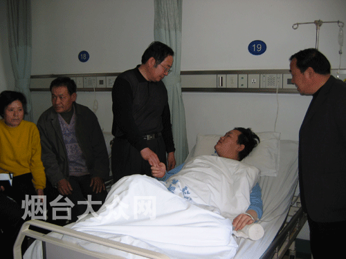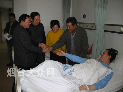 上午10时许,日照市精神文明办公室主任许崇亮和卫生局苏局长,以及莒县文明办和民政局的有关人士一起,来到了烟台毓璜顶医院。许许崇亮对孙运所母子说,“兰刚得了这个病,既是不幸,又有幸,不幸的是受到了病痛的折磨,有幸的是在烟台这个文明的城市里,受到了这么多好心市民的关注。在你们最困难的时候,烟台人没有把你们当外人。好好养病,将来病好后要更加热爱烟台,为烟台人民做出更大的贡献。”