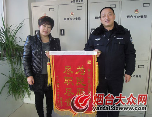 11月26日,芝罘区居民杨女士将一面写有“为民服务尽职尽职”的锦旗送到了芝罘公安分局南大街派出所,感谢该所的副所长周建营为其找回了遗失的皮包。11月23日,家住南上坊居民杨女士急匆匆地赶到南大街派出所求助,声称自已带孩子在振华商厦购物时,由于大意将皮包遗失在振华休息椅上,后来再去找就不见了,包内有钥匙、现金以及一些重要证件等物品。正在值班的副所长周建营闻知警情后,立即驱车到振华商厦调取现场及停车场监控录像,查到捡到皮包的男子车牌号,但通过公安系统查询,该车主的电话已停用。周建营又通过多方工作,终于和捡包人联系上,该男子随即将包送到了派出所。皮包失而复得,让杨女士非常激动,表示“尽管此事没构成案件,但民警这种认真负责、为民解忧的工作态度实在让她感动”。 通讯员 福基 王民 记者 王瑜 摄影报道