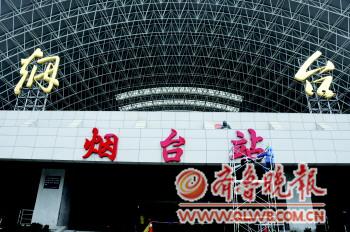 烟台火车站南口加上了“烟台站”三个大字。记者李大鹏摄