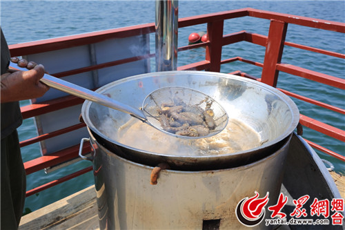 随后,猛子又如此反复地入海进行捕捞,收获了百余斤海参和其他海鲜满载而归。“海参上岸后立即用海水冲洗,并将内脏收拾出来,接着再放到锅内焯一下,随后用淡水冲洗,就可入高压锅蒸煮。”在海上休闲平台上,杨维通一边处理着海参,一边向记者介绍道。