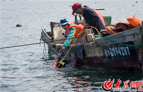 为了进一步体验打捞海参的乐趣,大众网记者随“猛子”(当地对海参捕捞员的俗称)一起出海捞海参。据杨家庄村支部书记杨维通介绍,当地渔民会在离陆地较远的海域设置网箱,而今天捕捞的海参则是4、5年前投放海底的海参苗,在没有人工干预的情况下自行觅食长大的。