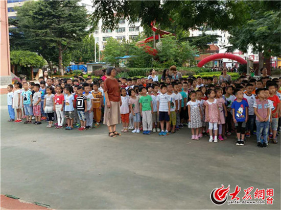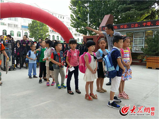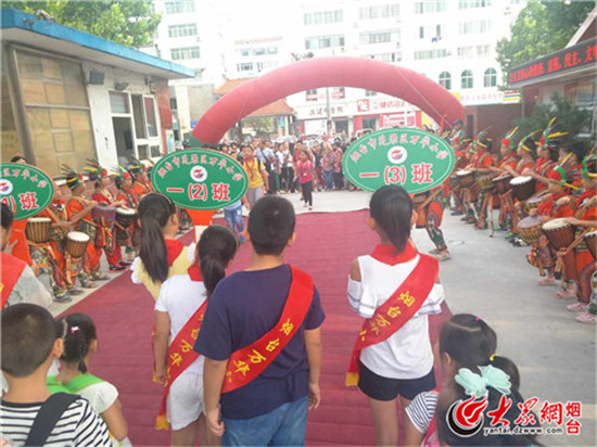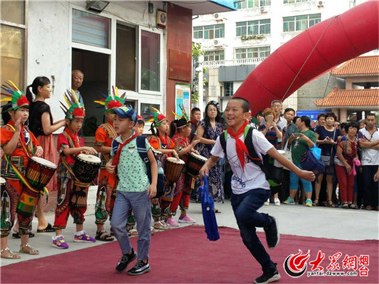 大众网烟台9月4日讯 (记者 蔡云飞 见习记者 刘子嘉) 9月4日,烟台万华小学迎来了“携手文明 快乐起航”2017年秋季开学典礼。一大早,学校门口就铺上了红毯,红毯两侧还有高年级小学生们带来的热情激昂的非洲鼓表演。182名万华小学一年级新生,在五年级“学长学姐”们的带领下,有模有样地走过红毯,开启属于他们的校园新生活。