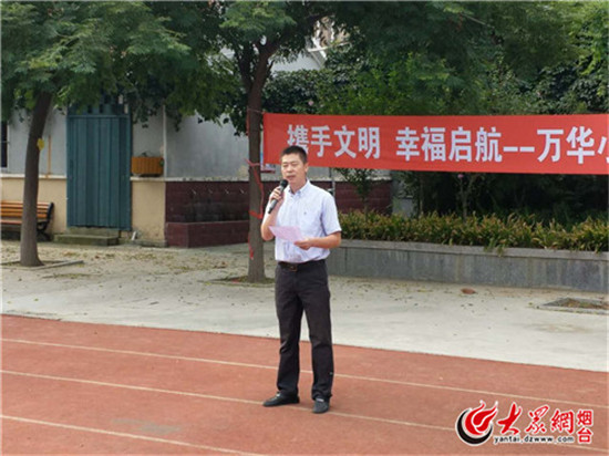 7:55,升旗仪式正式开始,万华小学高年级小学生们整齐肃立,敬少先队礼。一年级小学生们在老师的带领下,也整齐站好,向国旗行注目礼。“妈妈告诉过我,升国旗的时候要站好。”一年级学生丛云飞一边说,一边还不忘制止身边同学打闹。升旗仪式结束后,万华小学校长王书宁致开学辞:“当代著名作家余秋雨说‘生命,是一树花开。’我希望,在大楝树下求知的我们,能够以学校为骄傲,并积极继承和发扬我们的中华骄傲。像树儿一样成长,像花儿一样绽放,沐浴温暖阳光,享受教育幸福!”