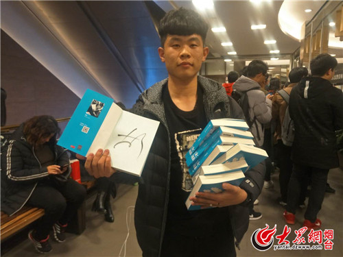 烟台大学大一新生刘帅甫是学校图书馆“图书漂流站”的成员,他抱着刚刚签好名8本书笑着说:“他本人果然与书中文字透露出来的一样,直率又贴心,握手的时候也非常认真。”刘帅甫表示,他本人受大冰的书籍影响颇深,不仅让他重新考虑穷游的意义,也让他决定毕业后长时间去偏远山区支教。