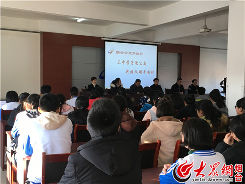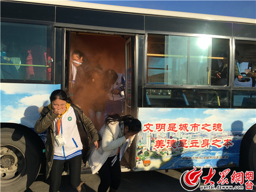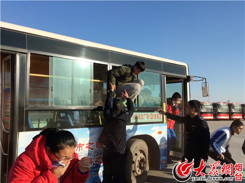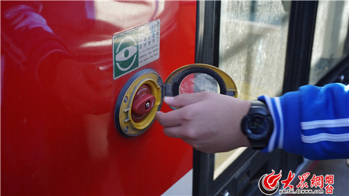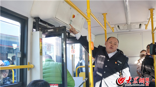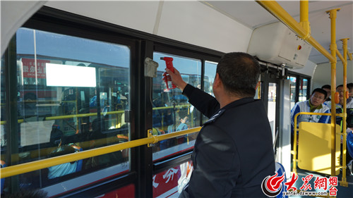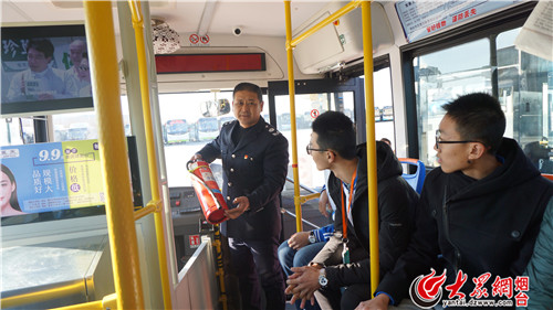 11月24日,“三中学子进公交、共建文明平安行”活动现场,烟台三中的师生们分成四组,登上4辆公交车,由驾驶员现场讲解了安全乘车知识及车内应急设施的使用方法以及应急逃生措施,以备遇到突发情况时,让师生们懂得如何自救和协助驾驶员进行互救。