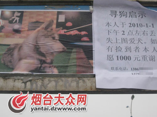 1月3日,记者在芝罘区桦林小区附近一站牌看到一张“雷人”寻狗启示(事),狗主人欲重赏1000元来寻找爱犬。附近市民对于该张寻狗启事有不同看法,市民张先生认为该狗主人把寻狗启事随便乱贴,影响了市容环境;另外有市民调侃道,该狗主人有钱寻狗不如在媒体上登启事,广撒大网,肯定能找到。 记者 王保珠 摄影报道
