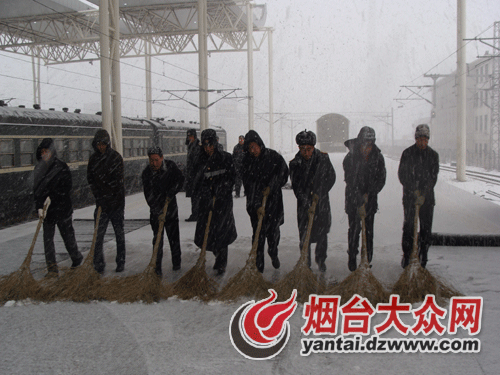 从天气预报中得知将有降雪、降温,烟台车务段及时发布了除雪令,蓝烟沿线各车站除雪队伍及党员除雪突击队严阵以待,扫帚、扁铲、铁锨等除雪工具准备到位。从8日上午,全段启动除雪预案,全面进入除雪状态,班子成员和各级干部迅速沉入一线现场监控,组织除雪。