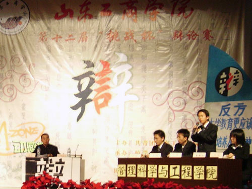 5月13日晚上六时,山东工商学院第十二届“挑战杯”辩论赛决赛拉开帷幕。本场辩论赛的双方分别来自管理科学与工程学院和工商管理学院,辩题为“大学教育更应注重人文精神还是科学精神”。整场辩论过程中辩手们不仅紧扣辩题做详细分析,更是不断举出贴近社会贴近生活的鲜活事例以增强说服力。最后,工商管理学院技高一筹,获得冠军。