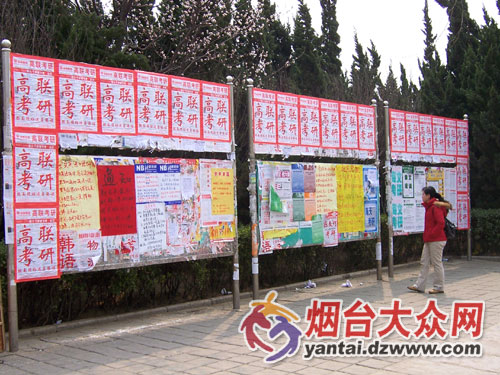 4月6日,记者从烟台大学校园里看到,校园里的十多处宣传栏无一例外都贴满了考研辅导广告,更有甚者为了增加视觉冲击力竟将广告贴了个“满堂彩”。专家提醒考研学生,选择辅导班应该慎重,以免上当受骗。记者 于伟伟 陈媛 摄影报道