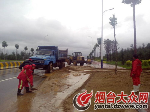 今年入夏以来,烟台市汛期降雨持久,且雨量较多。受暴雨的冲刷,山体及绿化带流下大量泥沙,直冲路面,导致莱山区莱源路、观海路、迎春大街等多处路段均出现大面积流黄和淤泥,尤其是莱源路部分路段包墙和山体坍塌、泥沙大量堆积在道板和快车道上,经雨水冲刷,路面形成厚厚的近50公分的淤泥沙石堆,在影响交通的同时,也严重影响了莱山区的环境卫生质量,更给环卫道路保洁工作带来了不小的困难。