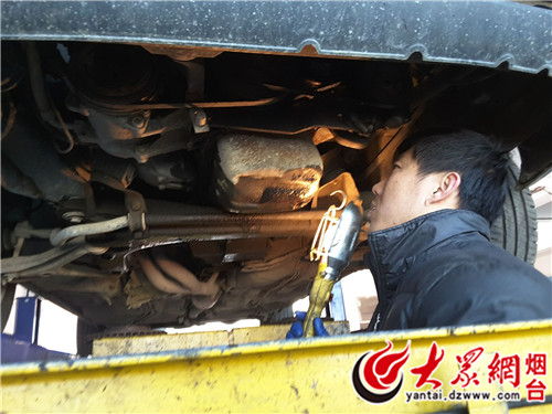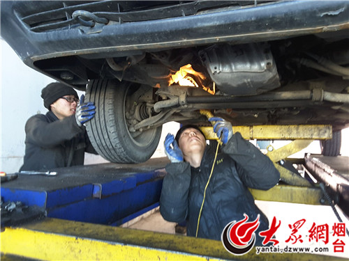 莱山公路局工作人员检查每辆车的发动机、底盘等关键部位
