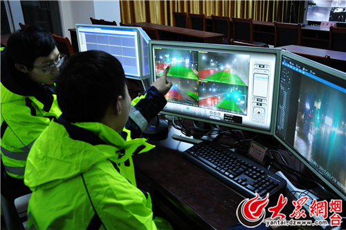 各清雪防滑突击队在一线奋战同时,莱山公路数字化管理中心的工作人员也在紧张地忙碌着。工作人员通过4*3*60寸大屏幕拼接、卡口高清网络摄像机、路政巡查车载网络摄像机实时查看路面降雪、清雪情况。