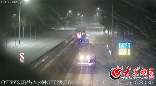 下午下班时间,降雪加大,路面结冰,莱山公路局8辆融雪剂撒布车全部出动,分别对观海路、轸大路、莱源路进行扬洒。清雪过程中,养护科、工程处及各车操作手通过数字对讲机多方通讯,现场情况实时传送。