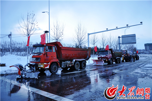 1月19日,烟台不时飘着点点雪花,根据天气预报情况,莱山公路清雪防滑突击队迅速集结,分别在公路沿线集中待命。