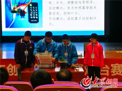 莱州一中邱炳然、刘桐坤、胡缨红、李奕璇等13名学生组成4队,分别带着“内置式智能光伏发电和辅助采光百叶窗”“爱耳精灵”“紫外线智能消毒饭盒”“智能停车场”4个作品参赛。