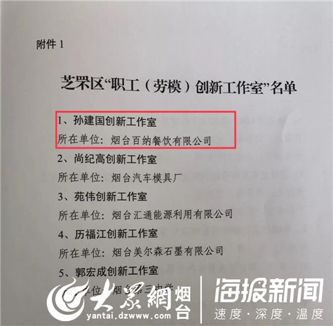 大众网烟台·海报新闻3月22日讯 3月21日上午,烟台市芝罘区工会工作会议在东山宾馆召开,百纳公司“孙建国创新工作室”获芝罘区“职工(劳模)创新工作室”荣誉称号;锦绣江南开发区店厨师李贵欣获芝罘区“最美一线职工”荣誉称号。