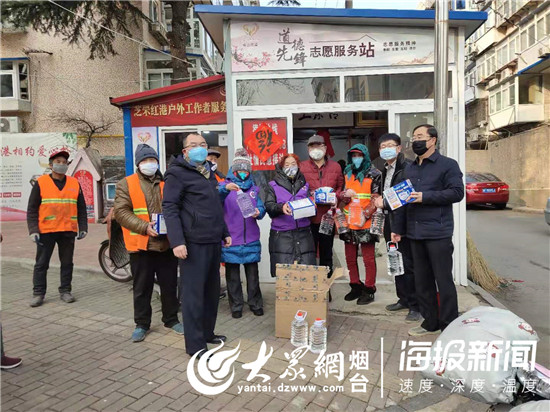 大众网·海报新闻烟台2月5日讯(记者 邹金利)疫情无情人有情,2月4日上午,民建芝罘八支部的两位会员代表将支部会员们捐献的价值一万多元的疫情防护用品口罩和酒精送到了奇山社区环卫工人手中。