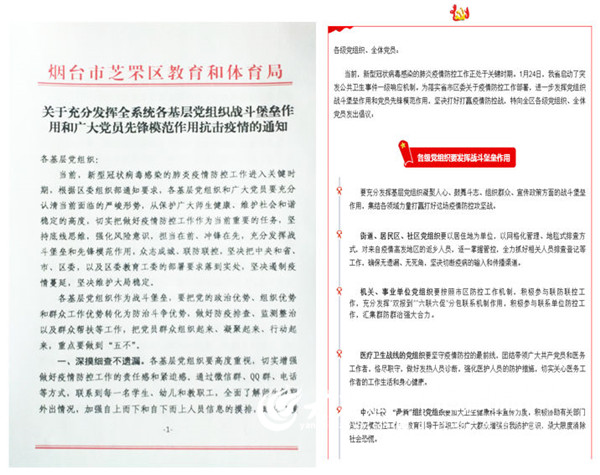 大众网·海报新闻烟台2月5日讯 (通讯员 王义晓 记者 邢晨) 疫情就是命令,防控就是责任。在防控新型冠状病毒感染肺炎疫情斗争中,烟台市芝罘区教育系统各级党组织和广大党员坚决贯彻落实党中央决策部署以及省委、市委、区委工作要求,从保护广大师生健康、维护社会和谐稳定的高度,切实把打赢疫情防控阻击战作为重大政治任务,强堡垒、当先锋、作表率,让党旗在防控疫情斗争第一线高高飘扬。