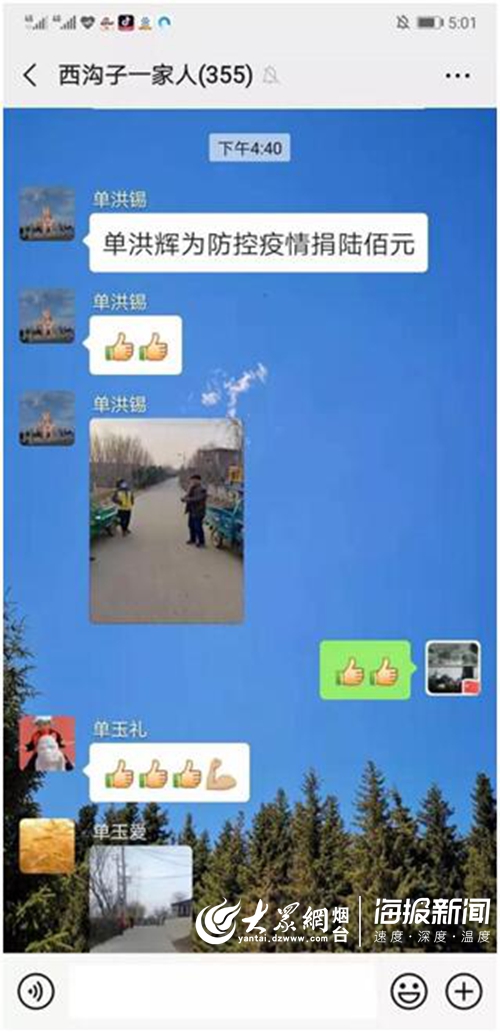 “勇哥,我也捐点心意,给值班的乡亲们。”“别。真不用了。”“应该的,我是党员,我那天走,我看到大家那么尽责任,天还怪冷的。”“土生土长的我们,树是根,是源,我们就像树叶,我们的孩子就像果实,…………”西沟子村党支部发挥模范带头作用,组织全村党员群众为村疫情防控工作捐款共计13100元,捐款工作仍在进行。其中,支部书记欧吉勇捐款10000元,村党员单洪升捐款1000元,村民邹天刚、邹天伟捐款1000元,单洪辉捐款600元,夏洪杰捐款500元。