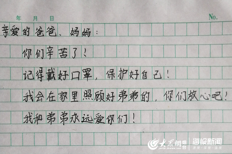 大众网·海报新闻烟台2月7日讯 (记者 李霞 通讯员 张国忠 王海艇) “亲爱的爸爸、妈妈:你们辛苦了!记得戴好口罩,保护好自己!我会在家里照顾好弟弟的,你们放心吧!我和弟弟永远爱你们!”