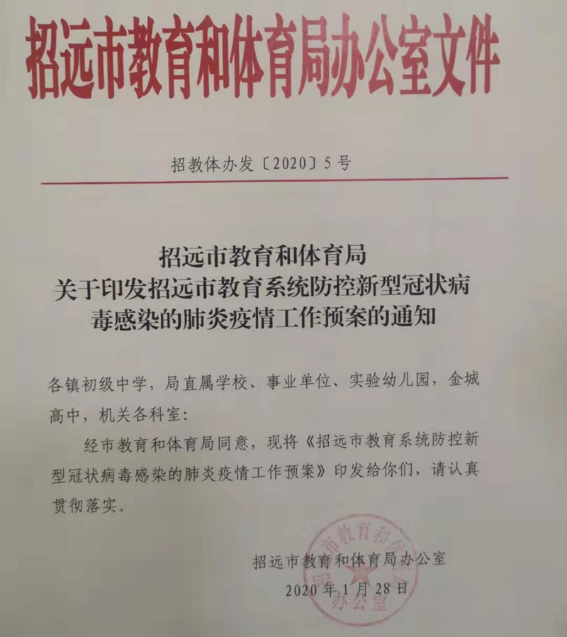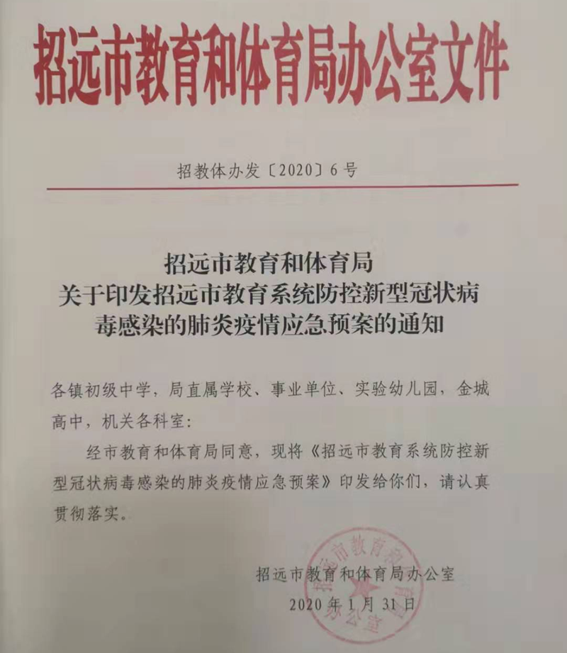 大众网·海报新闻烟台2月7日讯 (记者 薄晓娜 通讯员 李公杰) 疫情就是命令,防控就是责任。招远市教育和体育局把疫情防控作为当前最重要的工作来抓,全局上下迅速行动、周密部署、连续奋战、严密防范,坚决做到“六到位”,全力打好疫情防控阻击战。