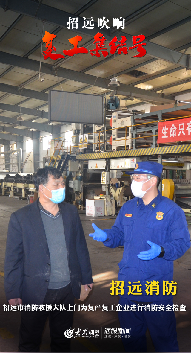招远市消防救援大队主动作为、靠前服务,上门为复产复工企业进行消防安全检查指导,消防救援大队专门抽调监督业务骨干对企业消防安全责任是否落实,日常消防安全检查是否到位,人员“四个能力”掌握情况,安全出口、消防通道是否畅通,消防器材是否完好有效,值班人员是否在岗在位等情况进行了详细检查。对于新冠肺炎防疫期间,企业使用酒精消毒等日常防疫工作,防火监督人员对企业在运输、储存和使用酒精灯易燃物品时的注意事项进行了指导培训。此外,还利用远程信息手段,采取“线上调度+线下自查”模式,实时调度企业消防安全管理工作。
