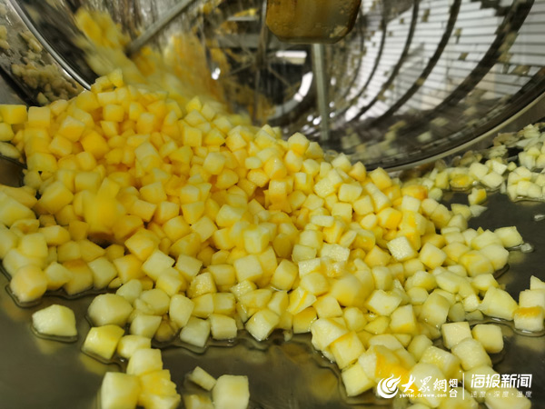 罐头产品线今天进行的是苹果切丁制法,制作好的苹果丁罐头供应日本最大的面包商,用于制作日本最畅销的苹果馅面包。2019年,日本客户邀请全球60余家苹果制品供应商进行盲评,无论是口感还是品相,联蕾食品以绝对优势获得第一名。