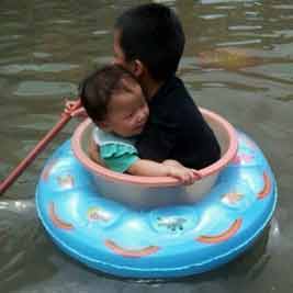 ▲哥哥,好样的!有网友拍到潮汕大水中有爱的一幕(如图):哥哥用瘦小的身躯保护着怀中的妹妹,有条不紊地划着救生圈将妹妹转移到安全的地方!