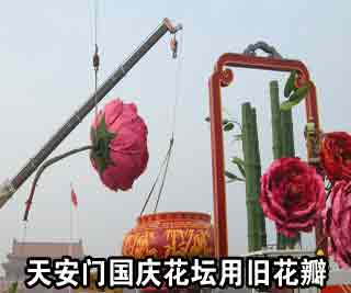 封面:今年天安门国庆花坛造型延续了去年牡丹花篮的造型,稍做修改成了牡丹花果篮。其中主花牡丹使用了去年曾用过的绢花花瓣。厉行节俭,朴素过节。(中新网)