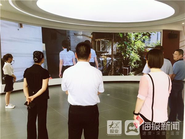 讲解员在引导参观者观看《让爱跨越山海·大爱民政 在您身边》宣传片