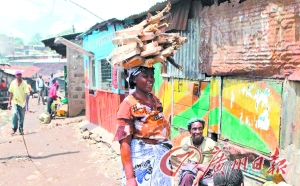 在肯尼亚内罗毕的马萨雷贫民窟内,一名妇女头顶木柴行走。