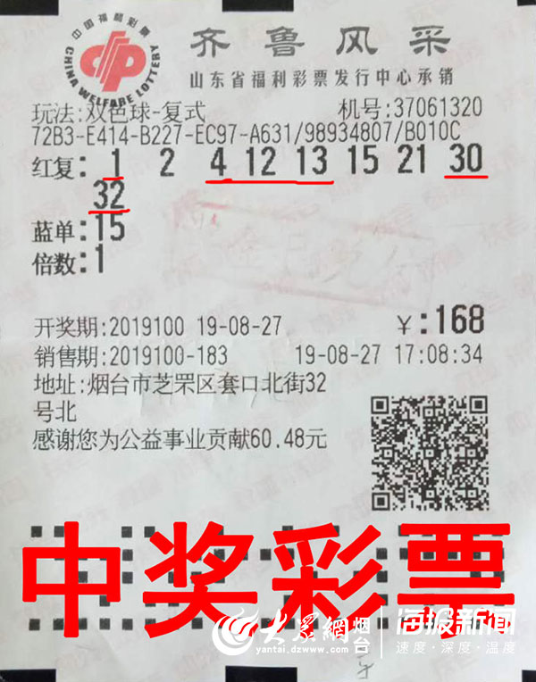 大众网烟台·海报新闻8月28日讯 (记者 李林) 进入秋天,太阳的“毒辣”依旧没有消减,但这丝毫不影响彩友们购彩的热情。8月27日晚,双色球2019100期开奖,烟台市芝罘区第37061320号站点中出一注双色球二等奖。28日早上,中奖彩友张先生(化姓)就来到烟台市福彩中心领走了他中得的404624元奖金。