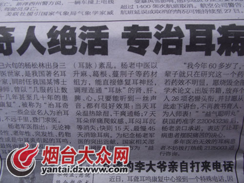 大众网烟台3月15日讯 (记者 王保珠 见习记者 王瑜) 因在报纸上看到一则治疗耳鸣的“奇药”,买了一个疗程服用,结果没有任何药效,70多岁的孙德荣老汉很是郁闷。